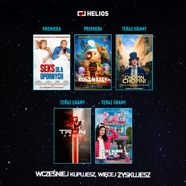 Jesień zachwyca rozmaitymi kolorami, a kaliski Helios zachęca kinomanów różnorodnym repertuarem, pełnym filmowych emocji. W nadchodzącym tygodniu na widzów będą czekać dwie premiery: „Seks dla opornych” oraz „Koszmarek”. Na ekranach nie zabraknie także wielkich hitów oraz stałych cykli. Ponadto kino Helios w Kaliszu i serwis streamingowy HBO Max zapraszają na premierowe, bezpłatne pokazy nowego serialu „To: Witajcie w Derry”!