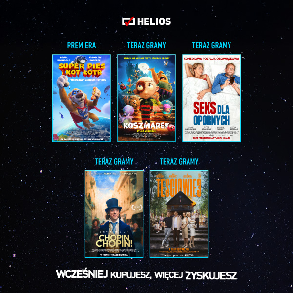 Nadchodzący tydzień w kinie Helios w Kaliszu przyniesie premierę animacji „Super pies i kot łotr”, jak też projekcje licznych filmowych hitów. Ponadto w repetuarze znajdą się rozmaite projekcje specjalne, w tym Nocny Maraton Filmowy w klimacie zbliżającego się Halloween oraz wyjątkowe seanse nowego serialu HBO Original „To: Witajcie w Derry”.